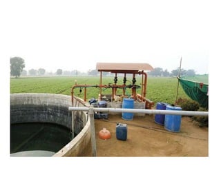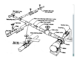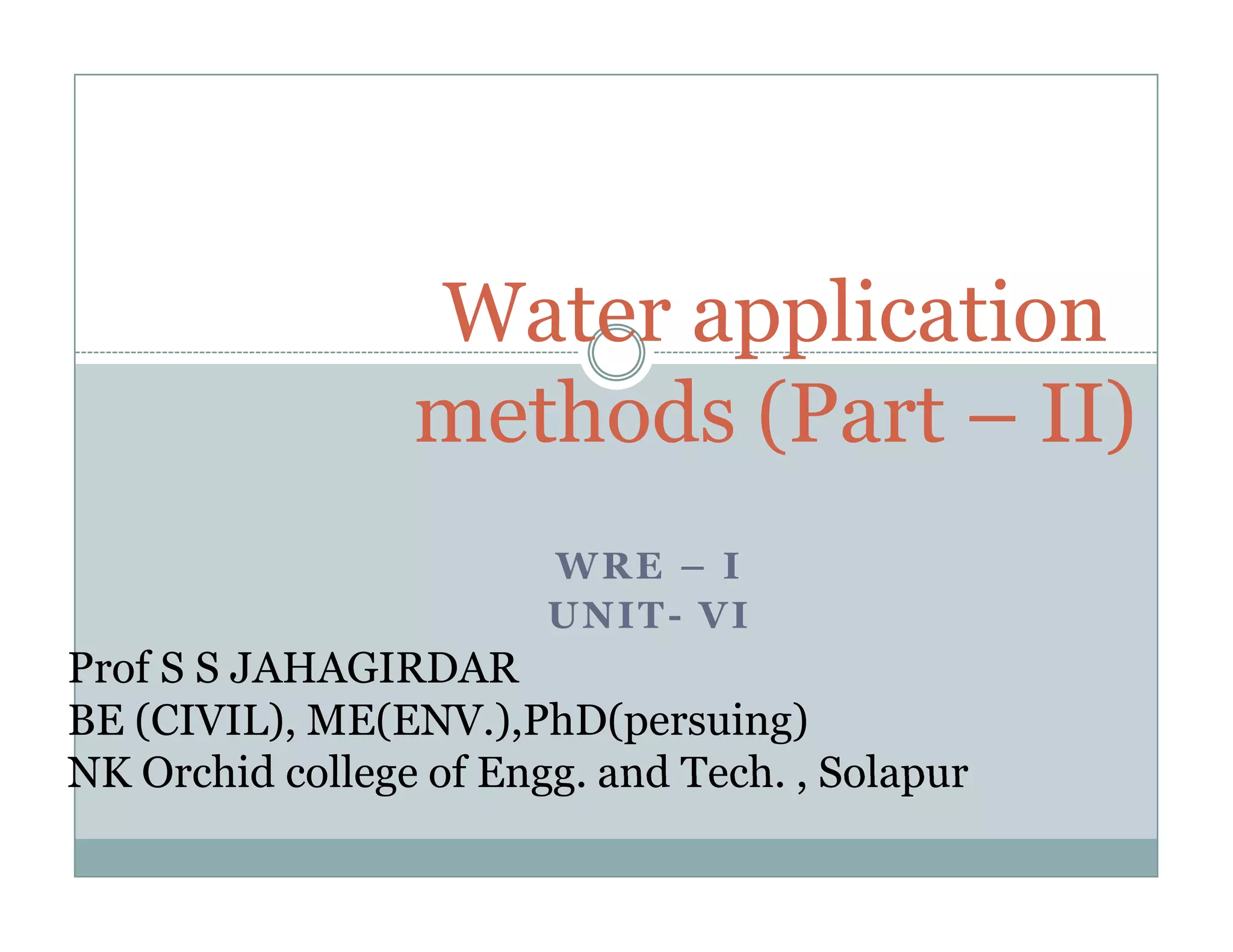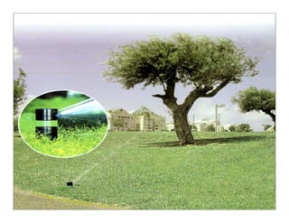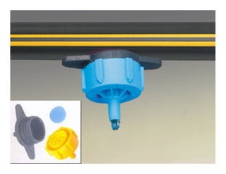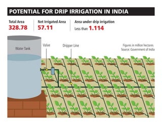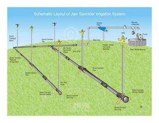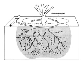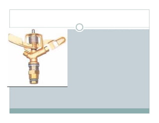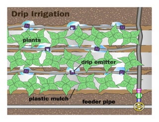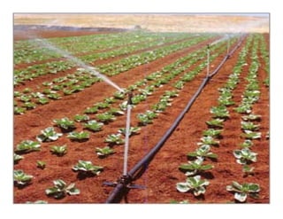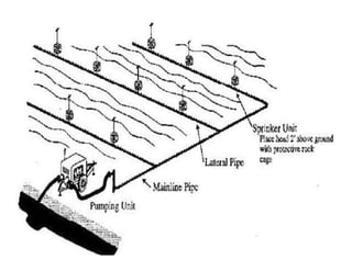 Drip irrigation and sprinkler irrigation are two common irrigation methods discussed in the document, with drip irrigation applying small quantities of water directly to plant roots through a network of pipes and emitters, while sprinkler irrigation sprays water into the air to fall on soil surfaces resembling rainfall using pumped water and sprinkler heads. The document outlines the components, operation, advantages, and limitations of each system along with their suitability for different crop types and soil conditions.