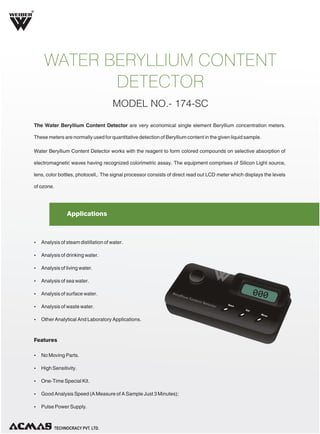 The document describes the R Water Beryllium Content Detector Model No. 174-SC, an economical single-element meter designed for quantitative detection of beryllium in liquid samples. It features a silicon light source, high sensitivity, low power consumption, and provides results within three minutes. Applications include analyses of various types of water, with specifications detailing a measurement range of 5.00-30.0 mg/l and an accuracy of ± 3%.