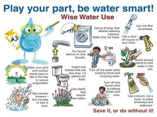 Water conservation is important for two main reasons: sustainability and energy conservation. Withdrawal of fresh water from ecosystems should not exceed natural replacement rates to ensure availability for future generations. Minimizing water use also helps conserve energy by reducing the need for pumping, delivery, and waste water treatment which require significant energy. While the water cycle naturally cleans and recycles water, human usage exceeds replenishment rates, depleting fresh water supplies as seen in India. Water conservation techniques like fixing leaks, running full loads of dishes and laundry, and limiting shower time can help solve this problem.
