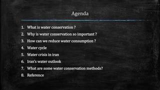 The document discusses water conservation and Iran's water crisis. It defines water conservation as reducing water usage and recycling wastewater. Water conservation is important because fresh water supplies are limited and only 1% of Earth's water is available for drinking. Iran is facing a severe water crisis as water usage is 70% higher than the global average, groundwater levels have dropped, and many lakes have dried up. The document outlines several methods for water conservation including reducing meat consumption, only running full loads of laundry, turning off faucets, and installing low-flow fixtures.