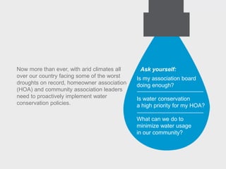 The document outlines strategies for homeowner associations and community leaders to implement water conservation measures in response to severe drought conditions. Key actions include installing water-saving fixtures, choosing drought-tolerant landscaping, educating residents, conducting energy audits, and partnering with property management companies. These efforts aim to minimize water usage, save costs, and improve the community's overall quality of life.