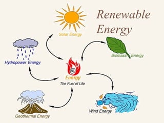 Renewable energy sources include solar, wind, hydro, tidal, geothermal, and wave energy. They generate pollution-free power and help reduce carbon emissions. Water conservation techniques either improve water quality or reduce usage through restricting flow or recycling water. Examples include waterless urinals, low-flow showerheads and faucets, front-loading washing machines, rainwater harvesting, and greywater recycling systems. These technologies save water, energy, and costs while helping the environment.