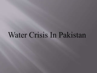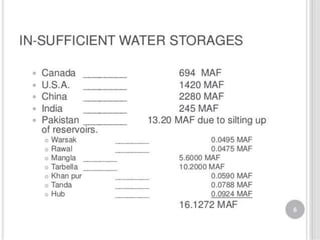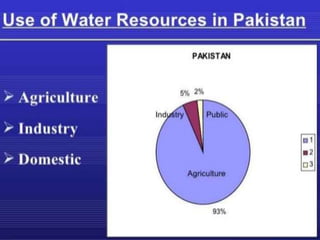 This document discusses Pakistan's water resources and issues related to water management and crisis. It mentions various dams, barrages and river basins that provide water resources in Pakistan. It then outlines factors contributing to water issues like reduced rainfall, poor management, climate change, lack of political will, and household ignorance. Rising population and decreasing availability of water per capita are said to be leading to a water crisis. The document calls for building more reservoirs and effective management to address the serious problems faced by the people.