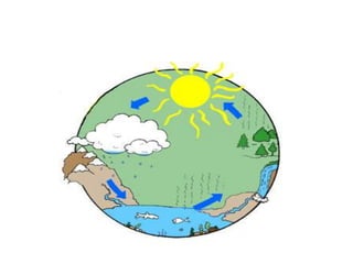 The water cycle describes how water is recycled on Earth. Water evaporates from bodies of water, forms clouds, and falls as precipitation like rain or snow. The water then collects in bodies of water like oceans, lakes, or rivers, where it can evaporate again and continue the cycle. The water we use today has been recycled through this process for billions of years.