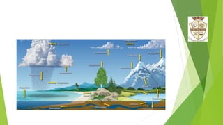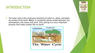 The water cycle describes the continuous movement of water on, above, and below the Earth's surface. Water evaporates from oceans, lakes, rivers, and soil and transpiration from plants. It rises into the atmosphere and condenses into clouds. Precipitation falls as rain or snow and either runs off into rivers and lakes or infiltrates into soils where it becomes groundwater or is absorbed by plants. Groundwater flows toward springs, rivers, lakes, and oceans, completing the cycle as water evaporates or transpires again into the air. This constant cycling is essential for sustaining life on Earth.