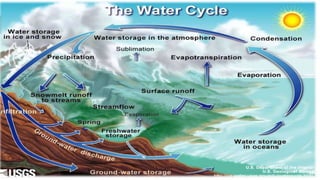 The water cycle consists of evaporation, transpiration, condensation, precipitation, and runoff. Evaporation occurs when water is heated by the sun and changes from a liquid to a gas. Transpiration is when water vapor is released from plants. Condensation happens when water vapor in the atmosphere cools and changes back to a liquid, forming clouds. Precipitation describes when this condensed water falls back to Earth as rain, snow, or hail. Runoff then transports this water across land through streams, rivers, and other pathways. Human activities like deforestation, urbanization, and agriculture can impact the water cycle by changing infiltration, runoff, and groundwater levels.
