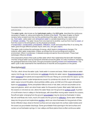 The water cycle describes the continuous movement of water on, above, and below the Earth's surface, driven by solar energy. Water evaporates from oceans and other bodies of water, rises into the atmosphere as water vapor, cools and condenses into clouds, and falls as precipitation onto land and oceans, where some infiltrates the ground and some runs off into rivers and lakes, eventually making its way back to the oceans, to complete the cycle. The water cycle involves the exchange of energy and is essential for life on Earth.
