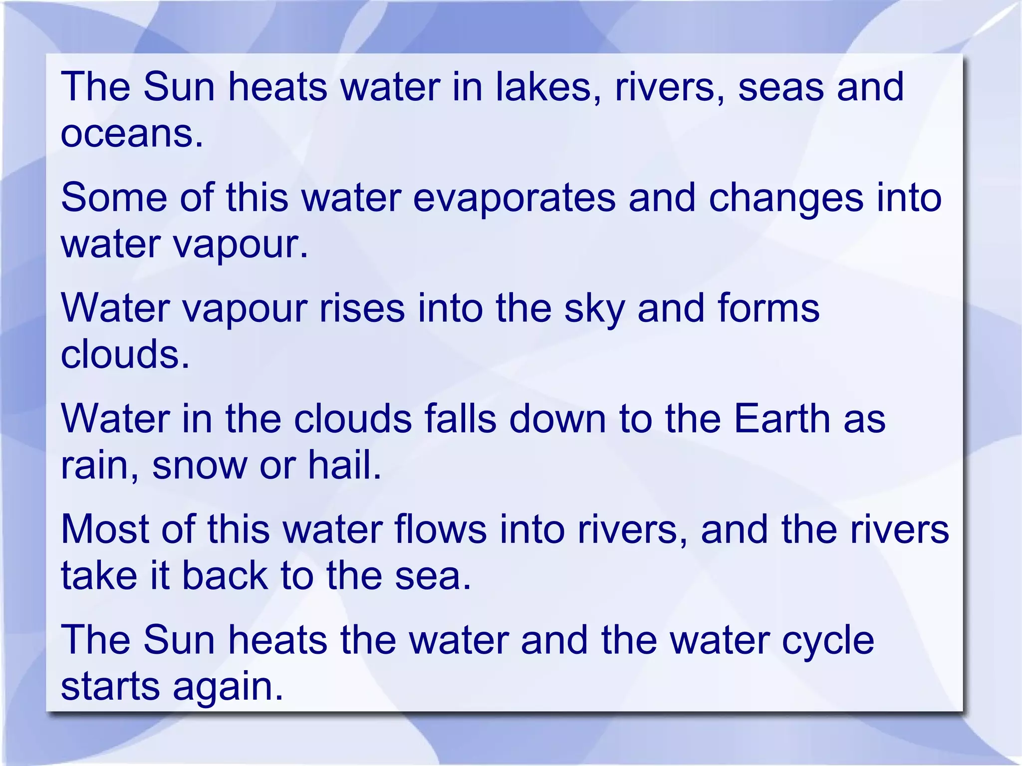 The water cycle describes how water is constantly moving and changing states between lakes, rivers, oceans, the atmosphere and land. The sun heats water on the Earth's surface, causing some of it to evaporate into water vapor and rise into the sky forming clouds. Water vapor in clouds condenses and falls back to the Earth as rain or snow, flowing into rivers and returning to oceans, where the cycle repeats.