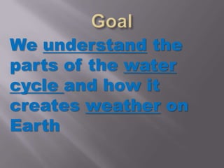 The document discusses the water cycle and weather. It explains that the water cycle is driven by solar energy and involves evaporation of water from sources like the ocean into water vapor, transpiration of water vapor from plants, condensation of water vapor into clouds, and precipitation in forms like rain or snow that falls back to water sources below to repeat the cycle. It also discusses different types of weather events like storms that can form from the water cycle and become dangerous, such as hurricanes, tornadoes, floods, or blizzards.