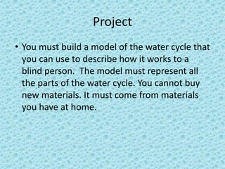 The document discusses the water cycle and related concepts. It includes 5 questions about the water cycle, sources of energy that drive it, how plants and animals contribute, how gravity affects it, key terms to illustrate it, and how the water table is affected. It also provides instructions for a project to build a water cycle model using household materials. Finally, it describes the water cycle process involving evaporation from oceans and transpiration from plants into the atmosphere, condensation into clouds, precipitation back to the Earth as rain, snow etc., and runoff and seepage back into water sources through rivers, streams or groundwater.