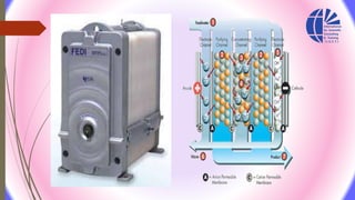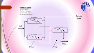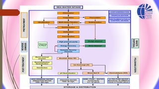 The document discusses various water desalination technologies, including thermal distillation, reverse osmosis, electrodialysis, and ion exchange. It provides detailed insights into the mechanisms, applications, and efficiency of these processes in producing potable water from saline sources, as well as challenges and factors affecting water quality. The text emphasizes the importance of pretreatment and post-treatment processes in ensuring the quality of the desalinated water.