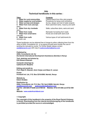 This document is a handbook on harvesting rainwater from roads. It provides guidance on diverting rainwater runoff from roads into storage structures like earth dams, water tanks, and subsurface dams. These structures can provide water for livestock, irrigation, and other uses while preventing erosion. The handbook contains details on the construction of different types of water storage structures like hemispherical tanks made of various materials, cylindrical underground tanks, ponds, and subsurface dams. It also discusses runoff farming techniques like soil bunds and macro-irrigation that make use of rainwater flowing from roads.
