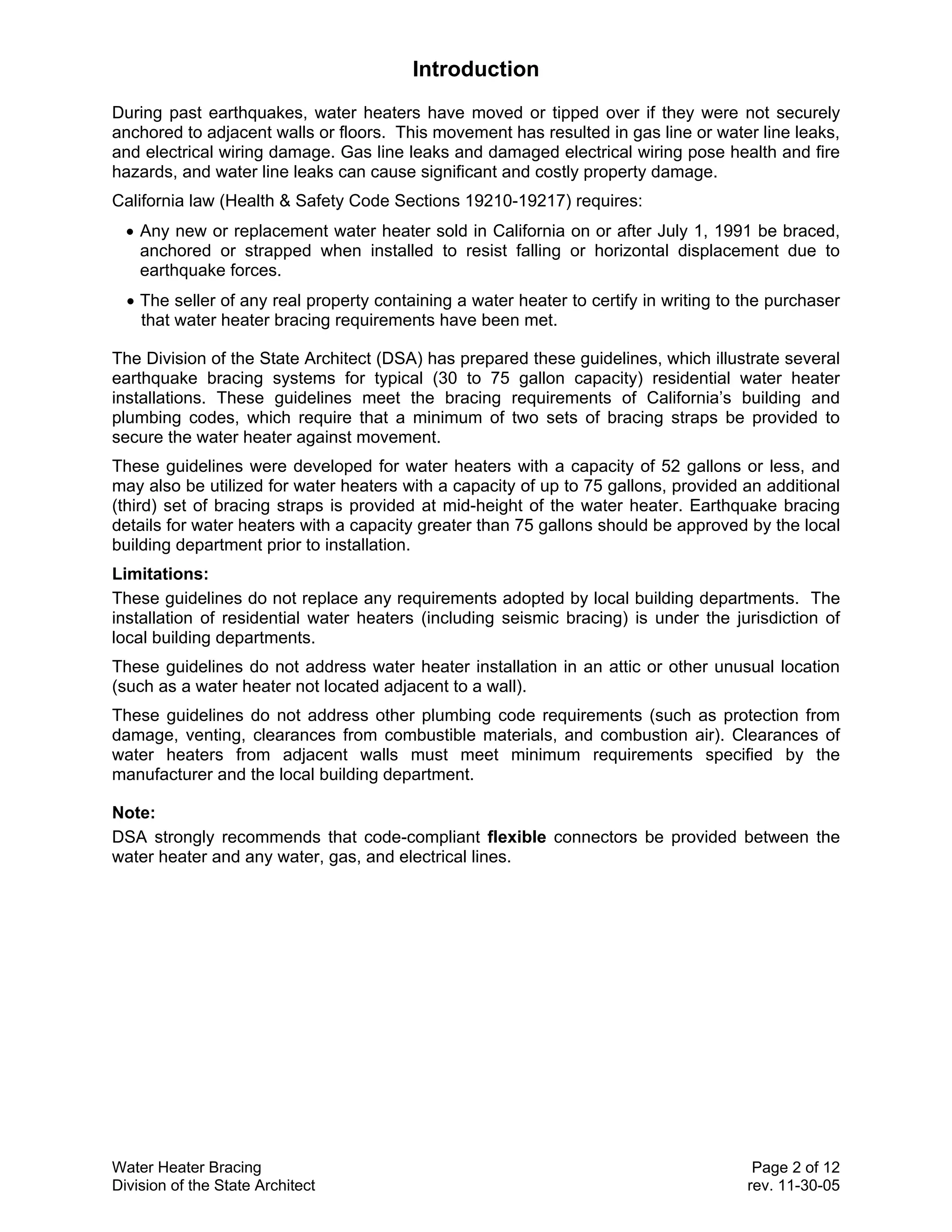 The document provides guidelines for bracing residential water heaters during earthquakes using plumber's tape or EMT conduit. It describes securing the water heater to an adjacent wall using two sets of bracing straps to prevent movement, leaks, and hazards. Methods are illustrated for water heaters near corners or straight walls. The guidelines are intended for water heaters up to 75 gallons, with additional bracing required for larger sizes.