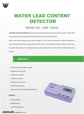 The document describes the Water Lead Content Detector Model ACM-158-SC, which is an economical single element lead concentration meter used to quantitatively detect lead content in liquid samples. It works with reagents to form colored compounds when electromagnetic waves are absorbed, which are detected by a silicon light source, lens, color bottles, and photocell. The signal processor displays lead levels on an LCD meter. It has a measuring range of 0.5-3.00 mg/L, uses the DPD method, and takes 3 minutes for analysis with features like no moving parts, high sensitivity, and low power consumption from a 9V battery.