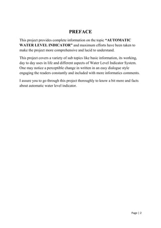 This document is a mini project report on the 'Automatic Water Level Indicator' submitted to T John Institute of Technology by engineering students Shahrukh Javed and Mohammed Amir. It details the project's objectives, components, working mechanism, advantages, and potential applications, emphasizing the practical benefits of the system in preventing water overflow and reducing wastage. The project is presented as a simple, efficient, and cost-effective solution suitable for various environments including homes and commercial establishments.