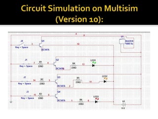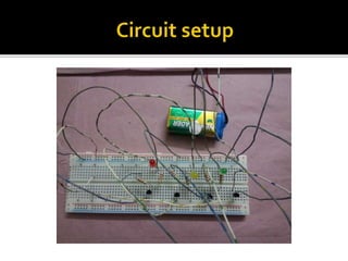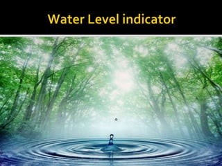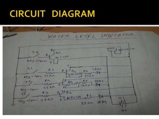 This document describes a simple water level indicator circuit using LEDs and transistors. The circuit uses 5 probes placed at different levels in a water tank to sense the water level. When the water touches the minimum level probe, an LED lights up to indicate a low water level. Additional LEDs light up when the water reaches medium and maximum levels. The circuit costs about 322 taka to build and can help conserve water and energy by detecting overflow and automatically shutting off water flow.