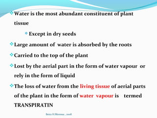 The document discusses different types of water loss from plants, including transpiration, guttation, and secretion/bleeding. It provides details on each process: