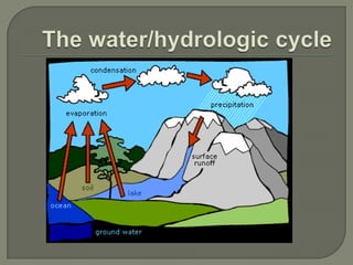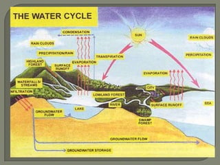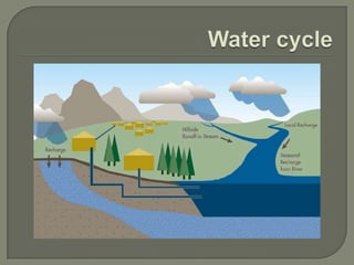 1) Water is found in three main forms - saltwater in oceans, freshwater in lakes/rivers/groundwater, and frozen water.
