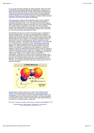 The water molecule is made up of two hydrogen atoms and one oxygen atom bonded at an angle of 105 degrees, giving water its polarity and ability to form hydrogen bonds between molecules. This hydrogen bonding allows water to absorb large amounts of heat without significant temperature change and exist in solid, liquid, and gas forms, unique properties important for moderating climate and sustaining life. Water's high heat capacity and heat of vaporization require significant energy input to change its state, slowing boiling and cooling.