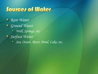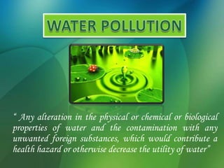 Water pollution occurs when foreign substances alter the physical, chemical, or biological properties of water. This makes the water a health hazard and decreases its usefulness. Sources of water pollution include sewage, industrial effluents, agricultural runoff, pathogens, toxic elements, radioactive pollutants, and thermal pollutants. Contaminated water can cause health issues like infectious diseases as well as making water unpleasant to drink or use for food processing. Standards and treatment methods are needed to ensure water quality.