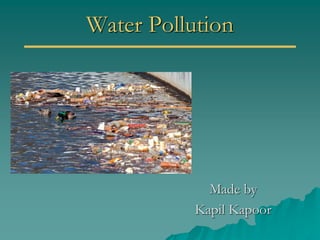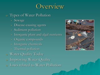 The document provides an overview of water pollution, detailing its types including sewage, disease-causing agents, sediment, and thermal pollution, along with the challenges posed to water quality globally. It discusses sources of pollution, such as agricultural runoff and industrial discharges, and highlights specific cases like pollution in the Ganges and the Po River. The document also outlines treatment methods for sewage and relevant laws aimed at controlling water pollution.