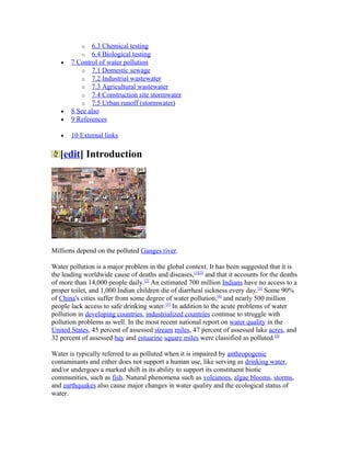 Water pollution occurs when harmful substances affect water quality in rivers, lakes, oceans, and groundwater. It has significant negative impacts on human health and ecosystems. The main causes are untreated sewage, industrial and agricultural waste, urban and stormwater runoff containing pathogens, chemicals, excess nutrients and other contaminants. Effective control requires treatment of domestic sewage and industrial wastewater before discharge, as well as management approaches to reduce non-point pollution from sources such as agriculture and construction sites.