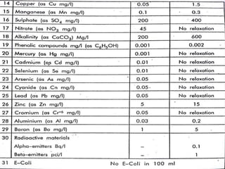 This document discusses various aspects of water pollution including its definition, sources, parameters used to measure it, and methods for controlling it. Water pollution is defined as contamination that makes water harmful to living organisms. It can originate from point sources like pipes or non-point sources like agricultural runoff. Key parameters for assessing water quality include physical factors like turbidity, chemical measurements like pH levels, and biological indicators like E. coli. The document also covers topics like eutrophication, biochemical oxygen demand, and steps individuals can take to reduce pollution like proper waste disposal and water conservation.