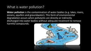 Water pollution is the contamination of water bodies due to harmful pollutants from various sources, including industrial waste, sewage, and agricultural runoff. It can lead to severe ecological and health issues, including the death of aquatic life, disruption of food chains, and human diseases. Control measures include recycling, public awareness, and strict regulations to prevent water pollution and promote sustainable management of water resources.