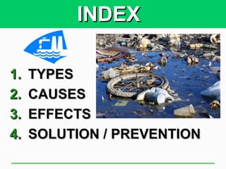 This presentation discusses water pollution. It covers the types of water pollution including inorganic, organic, and biologic pollutants. The causes of water pollution are discussed as rural homes, city development, factories, and wastewater treatment plants. The effects of water pollution include toxic drinking water and health problems. Solutions presented are desalination, improving irrigation and collection efficiency, using less water, and sewage treatment systems. The presentation concludes by emphasizing the 3 R's of refuse, recycle, and reduce to prevent further water pollution.