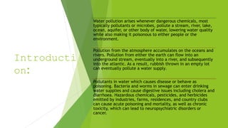 Water pollution arises from both natural causes and human activities that introduce dangerous chemicals and microbes into bodies of water. The main types of water pollution are pollution of oceans, surface water, and groundwater. Water pollution has negative effects on ecosystems by damaging plant and animal life and causing dead zones, and it also threatens human health by contaminating drinking water and making people sick. Key causes of water pollution include agriculture, industry, transportation accidents, and dumping of garbage. Prevention efforts include proper disposal of trash, chemicals, and spilled materials to keep pollutants out of waterways.