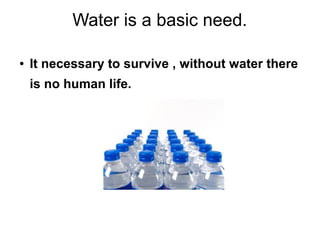 Water is essential for human life and survival. However, millions of people lack access to fresh water due to various causes such as lack of infrastructure. There are alternative methods for water purification that could help provide more people with access to fresh water. The overuse and pollution of water resources poses threats to both the environment and human health through water-borne diseases. A more sustainable approach to managing and using water is needed.