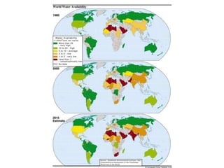 This document discusses the global water crisis and its social, economic, political, and environmental consequences. It notes that over 1 billion people lack access to safe drinking water. Key facts provided include that 3900 children die daily from water-borne diseases. The document then discusses specific examples of water issues and consequences in countries like China, India, Israel, Egypt, and Mexico. Potential solutions to the crisis mentioned include increased conservation efforts, wastewater recycling, and desalination.