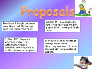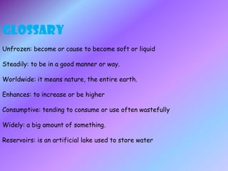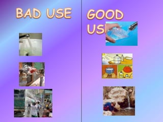 The document discusses different ways that people use water resources. It describes household uses like drinking, bathing, cooking, sanitation, and gardening. Recreational uses include activities like going to the pool or beach, fishing, and surfing. The largest portion of water usage is for agricultural irrigation, which accounts for 69% of total water use. Other uses include industrial applications like power plants and manufacturing, as well as environmental and recreational activities. The document emphasizes that water is a limited resource and its conservation is important.