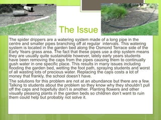 The spider drippers watering system in the Early Years garden bed has been damaged by students pulling off the caps, causing flooding, wasting water, and costly repairs. To address this, the authors plan to talk to classes about why not to damage the drippers, and plant native flowers to beautify the bed and discourage disruption. They chose this low-cost, easy solution over monitors which may not always prevent damage.