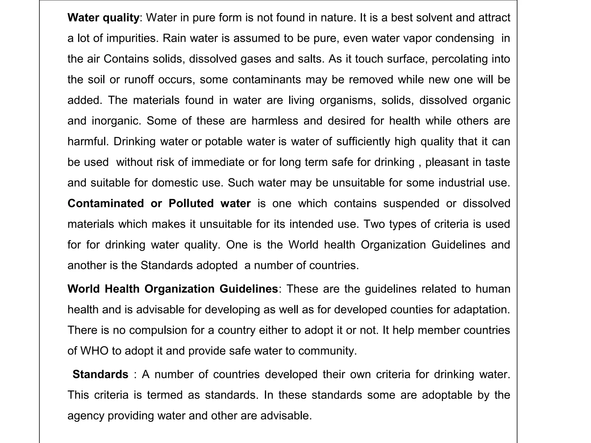 The document discusses water quality and drinking water standards. It provides information on various types of water quality parameters including physical, chemical, and biological characteristics. It describes factors that affect water quality such as contamination from living organisms, solids, and dissolved materials. It also outlines primary and secondary drinking water standards from organizations like the WHO and EPA, which establish limits for parameters to protect human health and aesthetic quality. Regular water quality monitoring is emphasized to ensure standards are being met.