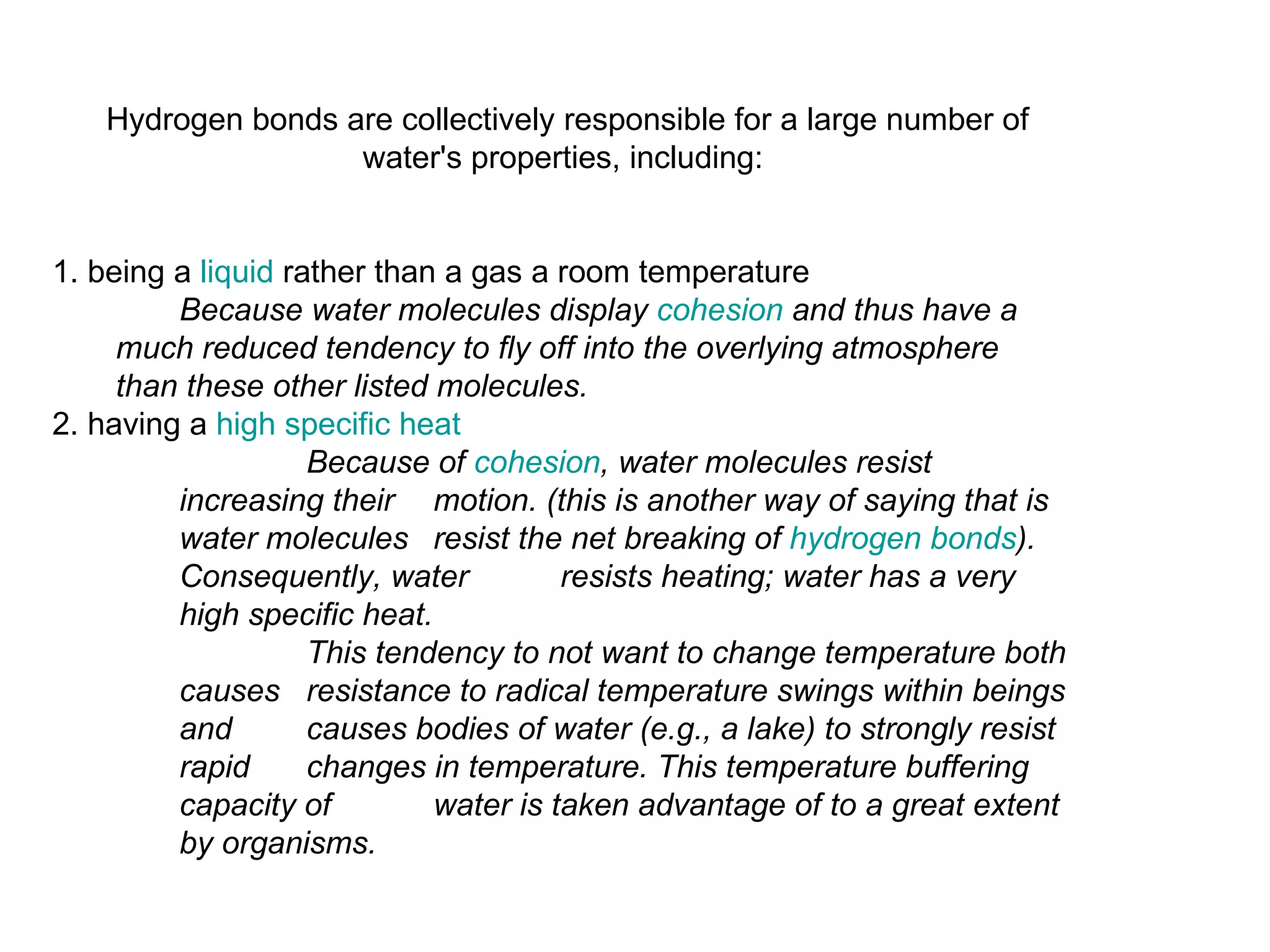 2. Having a high specific heat capacity because breaking hydrogen bonds requires energy.