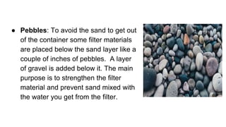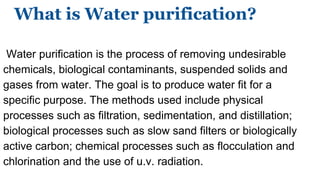 Water purification without electricity can be achieved through various physical and biological processes. Untreated water sources like rivers and reservoirs require sedimentation to allow dirt and debris to settle. The water then passes through a multi-layer filter of gravel, pebbles, sand and charcoal. Each layer removes different impurities. Charcoal filtration is effective at removing toxins and odors without chemicals. It produces healthy, safe drinking water in an affordable way suitable for off-grid areas.