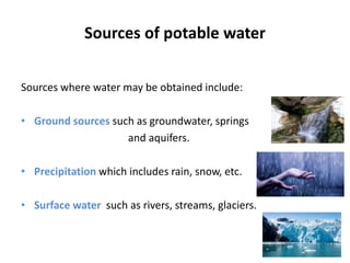 This document discusses water purification methods for both large and small scale. For large scale, it describes treating raw water sources through storage, filtration, and disinfection using chlorination, ozonation, or UV irradiation. Slow sand filtration and chlorination are effective at removing bacteria, viruses, and parasites. For small scale, it recommends boiling, chemical disinfection, or ceramic filtration. Wells can be disinfected during outbreaks by bleaching. Bottled water may be purified through multiple barriers like UV, distillation, or ozonation.