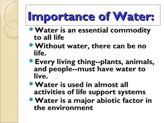 The document discusses the importance and characteristics of water, emphasizing its essential role in sustaining life and various activities. It outlines the distribution of water on Earth, the significance of water quality parameters (physical, chemical, and biological), and how these parameters determine water's suitability for drinking, agriculture, and industrial use. Additionally, it highlights the various standards for water quality and the implications of water quality on health and the environment.