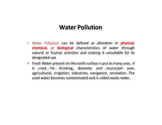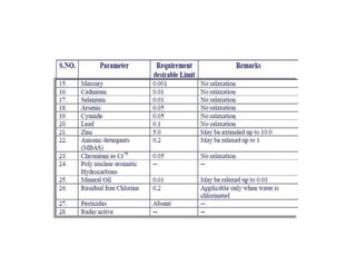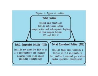 The document discusses various water quality parameters including water pollution, water quality standards, and important requirements of water for domestic use. It defines total solids as the total of all solids in a water sample, including total suspended solids, total dissolved solids, and volatile suspended solids. It also discusses how total solids are measured by weighing the solids present in a known water sample volume before and after drying to evaporate the water. The document provides classifications of impurities based on size and nature, and describes several common methods for analyzing water quality parameters.