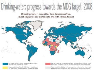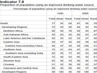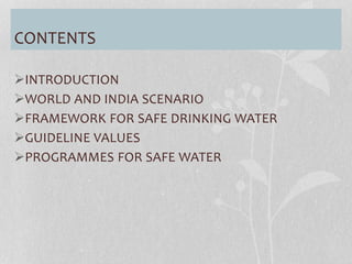 The document discusses India's efforts to provide safe drinking water to its population. It notes that in 1975, over 1 billion people globally lacked access to safe water. In response, India developed various five-year plans from 1980-1997 to expand access, with the goal of supplying safe water to all rural villages. Key aspects of ensuring water safety discussed include water quality standards, testing for contaminants, monitoring programs, and strategies like water treatment and sanitation inspections. The document also examines health impacts of contaminated water and international targets for access to improved water sources.