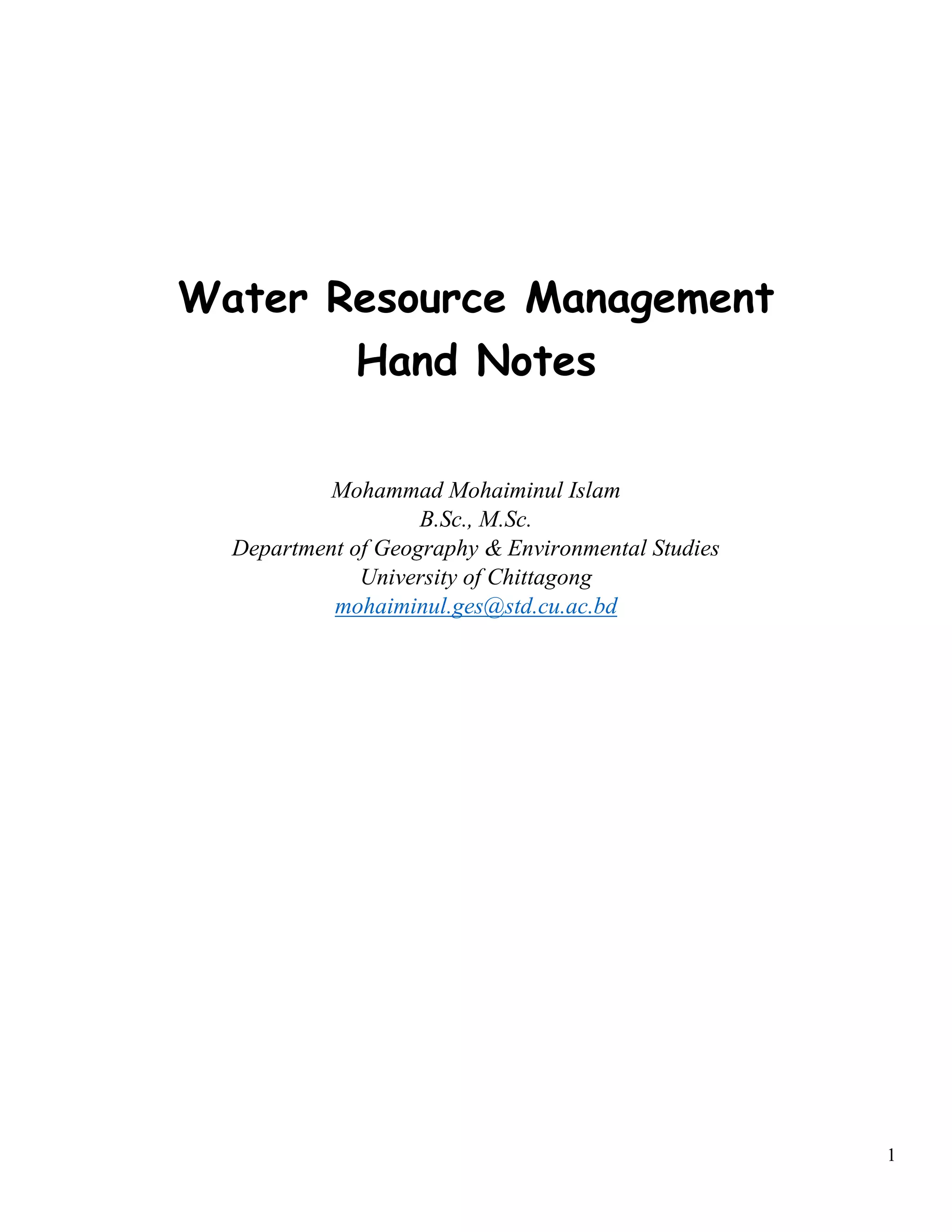 The document discusses water resource management (WRM) and integrated water resource management (IWRM) in Bangladesh, highlighting its importance for the sustainability of ecosystems and economic welfare. It outlines fundamental concepts, goals, challenges, and the varying sources of water in Bangladesh, such as rainfall and transboundary rivers. The text emphasizes the urgency of addressing issues like climate change, urbanization, and unrestricted water extraction to safeguard water resources for future generations.