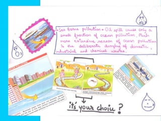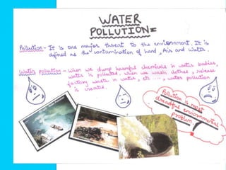 This document is a virtual booklet about water resources that discusses how water is used by people, the importance of conserving water resources, and some proposals for doing so. It notes that most of the world's water is undrinkable and located in oceans, while sources of fresh water include surface water, groundwater, and frozen water. It outlines how water is used for household, personal, agricultural, industrial, recreational, and environmental purposes. The document also discusses both wasteful and efficient water usage habits.