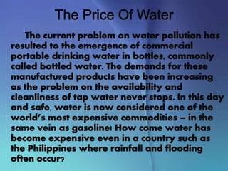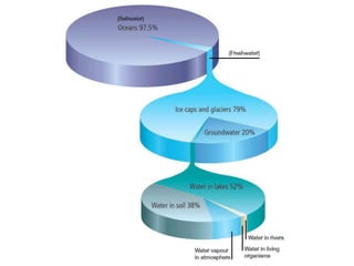 The document discusses the hydrologic cycle, which involves the continuous circulation of water on Earth through different states and processes. It explains that evaporation occurs when water molecules gain energy and change from liquid to gas, condensation is when water vapor condenses to form clouds, and precipitation delivers water to the Earth's surface. The hydrologic cycle begins with evaporation from the ocean, water being transported through the atmosphere, precipitation, and water running off or seeping into the ground to eventually return to the oceans.