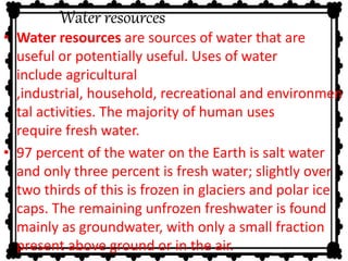 Fresh water resources are critical for human and environmental needs. While water covers most of the Earth, only 3% is fresh water. The majority is frozen in glaciers and ice caps, while the remaining unfrozen fresh water exists as groundwater, surface water, or atmospheric water. Groundwater levels are declining in many regions due to excessive human use. Surface water comes from rivers, lakes, and wetlands, but human activities like reservoir construction and wetland drainage have large impacts on water resources. Underground river networks also contribute substantial water flow. Groundwater exists below the ground in soil and rock and is replenished by surface water, but humans can deplete it unsustainably through overuse or pollution. Desalination of
