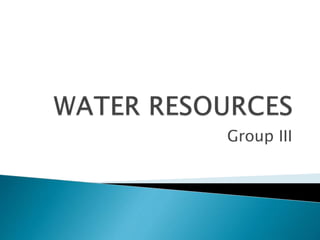 This document discusses water resources on Earth. It begins by explaining that water is essential for all life and exists in three states: liquid, solid, and gas. It then outlines the major sources and locations of water, including oceans, glaciers, groundwater, and surface water sources like rivers and lakes. The document also discusses water quality categories and regulation in the Philippines. In the end, it lists sources used to research this topic.