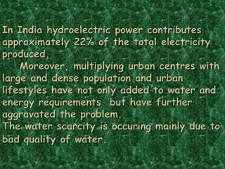 Three-fourths of the world is covered in water, with 96.5% existing as ocean water and only 2.5% as freshwater. 70% of freshwater is stored as ice sheets and glaciers in Antarctica, Greenland, and mountainous regions. Less than 30% of freshwater is stored as groundwater. India receives nearly 4% of global precipitation but ranks 133rd in the world for available water per person annually. Water scarcity is caused by over-exploitation, excessive use, and unequal access among populations. Traditional water harvesting and storage methods were used in different areas of India to conserve water, such as guls, kuls, rooftop rainwater harvesting, and underground tanks.