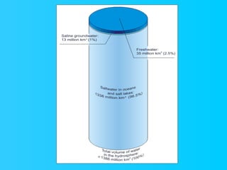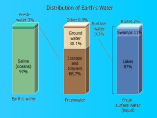 The document discusses various ways that people use water resources. It describes how water is used for agricultural, industrial, household, and recreational purposes. It also discusses the importance of conserving water resources and preventing water pollution given that only 3% of the Earth's water is freshwater and demand for water is rising as the global population increases.