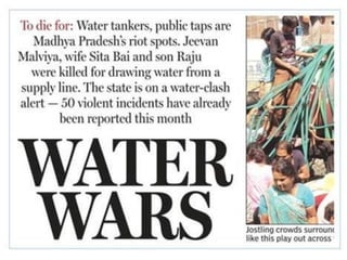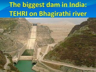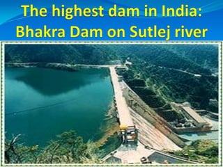 The document discusses facts about water resources globally and in India. Three-fourths of the Earth's surface is covered in water, but only 3% is freshwater. India receives 4% of global precipitation but has 17% of the world's population. Dams were traditionally built for irrigation, electricity, and flood control, but large dams have negative environmental and social impacts and cause disputes between states and countries over water rights. Ancient India had sophisticated rainwater harvesting systems to collect and store water.