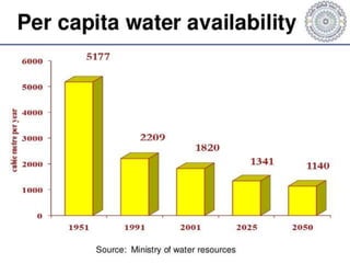 This document summarizes water resources in India. It discusses that India receives adequate annual rainfall on average but experiences water scarcity due to uneven rainfall distribution and lack of conservation efforts. The major sources of water are rainwater, surface water from rivers, and groundwater. India's major river systems include the Ganga-Brahmaputra-Meghna system which has the largest catchment area. Groundwater meets irrigation, drinking, and other domestic needs. Wells irrigate over 60% of India's total irrigated area. The document then provides specifics on water resources in the state of Maharashtra, noting its semi-arid climate and sources of irrigation including wells and micro-irrigation systems.
